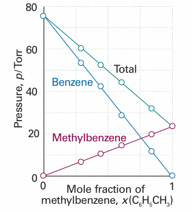 Fig. 5.12 Two similar liquids, in this case benzene and methylbenzene (toluene), behave almost ideally, and the variation of their vapour pressures with composition resembles that for an ideal solution.