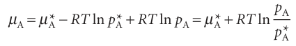 Next, we combine these two equations to eliminate the standard chemical potential of the gas. To do so, we write eqn 5.21 as µAO = µA* – RT ln pA* and substitute this expression into eqn 5.22 to obtain