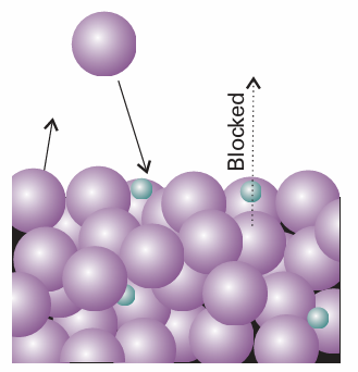 Fig. 5.13 A pictorial representation of the molecular basis of Raoult’s law. The large spheres represent solvent molecules at the surface of a solution (the uppermost line of spheres), and the small spheres are solute molecules. The latter hinder the escape of solvent molecules into the vapour, but do not hinder their return.