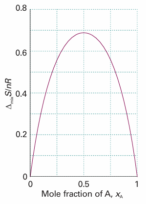 Fig. 5.9 The entropy of mixing of two perfect gases and (as discussed later) of two liquids that form an ideal solution. The entropy increases for all compositions and temperatures, so perfect gases mix spontaneously in all proportions. Because there is no transfer of heat to the surroundings when perfect gases mix, the entropy of the surroundings is unchanged. Hence, the graph also shows the total entropy of the system plus the surroundings when perfect gases mix.