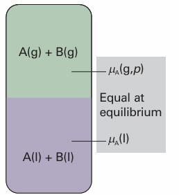 Fig. 5.10 At equilibrium, the chemical potential of the gaseous form of a substance A is equal to the chemical potential of its condensed phase. The equality is preserved if a solute is also present. Because the chemical potential of A in the vapour depends on its partial vapour pressure, it follows that the chemical potential of liquid A can be related to its partial vapour pressure.