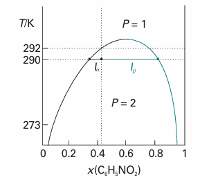 Suppose a small amount of a liquid B is added to a sample of another liquid A at a temperature T′. It dissolves completely, and the binary system remains a single phase. As more B is added, a stage comes at which no more dissolves. The sample now consists of two phases in equilibrium with each other (P = 2), the most abundant one consisting of A saturated with B, the minor one a trace of B saturated with A. In the temperature–composition diagram drawn in Fig. 6.19, the composition of the former is represented by the point a′ and that of the latter by the point a″. The relative abundances of the two phases are given by the lever rule. When more B is added, A dissolves in it slightly. The compositions of the two phases in equilibrium remain a′ and a″ because P = 2 implies that F′=0, and hence that the compositions of the phases are invariant at a fixed temperature and pressure. However, the amount of one phase increases at the expense of the other. A stage is reached when so much B is present that it can dissolve all the A, and the system reverts to a single phase. The addition of more B now simply dilutes the solution, and from then on it remains a single phase. The composition of the two phases at equilibrium varies with the temperature. For hexane and nitrobenzene, raising the temperature increases their miscibility. The two-phase system therefore becomes less extensive, because each phase in equilibrium is richer in its minor component: the A-rich phase is richer in B and the B-rich phase is richer in A. We can construct the entire phase diagram by repeating the observations at different temperatures and drawing the envelope of the two-phase region.