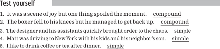 Keep in mind that a compound phrase is not the same thing as a compound sentence. For example, the following sentence has a compound noun phrase (underlined):