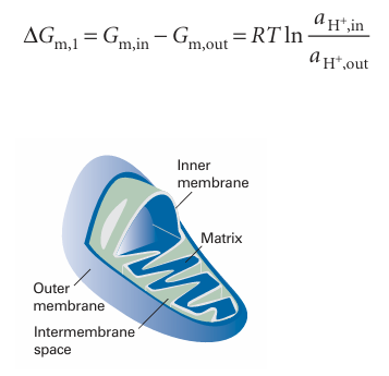 In the mitochondrion, ∆pH ≈−1.4 and ∆φ≈0.14 V, so ∆Gm≈+21.5 kJ mol−1. Because 31 kJ mol−1 is needed for phosphorylation, we conclude that at least 2 mol H+ (and probably more) must flow through the membrane for the phosphorylation of 1 mol ADP.