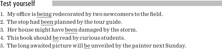 As we mentioned, passive be (in all its forms) is a kind of helping verb, occurring right before the main verb. In a sentence that has other helping verbs as well, the passive be is always the last one. You can see that in the following sentences, where the form of the passive be is underlined and the other helping verbs are in bold: