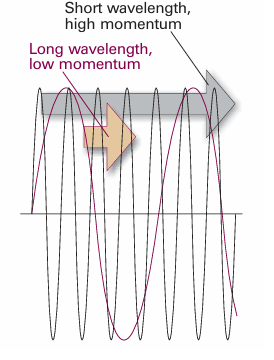 Fig. 8.16 An illustration of the de Broglie relation between momentum and wavelength. The wave is associated with a particle (shortly this wave will be seen to be the wavefunction of the particle). A particle with high momentum has a wavefunction with a short wavelength, and vice versa.