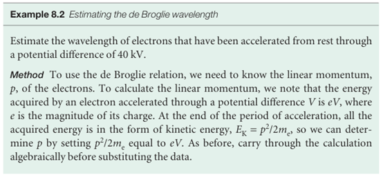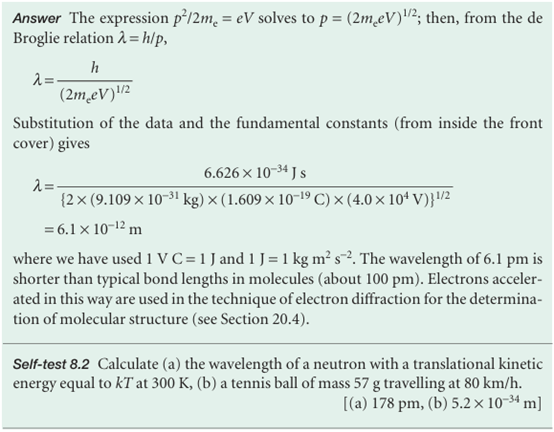 Although contrary to the long-established wave theory of light, the view that light con sists of particles had been held before, but discarded. No significant scientist, however, had taken the view that matter is wave-like. Nevertheless, experiments carried out in 1925 forced people to consider that possibility. The crucial experiment was performed by the American physicists Clinton Davisson and Lester Germer, who observed the diffraction of electrons by a crystal (Fig. 8.15). Diffraction is the interference caused by an object in the path of waves. Depending on whether the interference is constructive or destructive, the result is a region of enhanced or diminished intensity of the wave. Davisson and Germer’s success was a lucky accident, because a chance rise of temper ature caused their polycrystalline sample to anneal, and the ordered planes of atoms then acted as a diffraction grating. At almost the same time, G.P. Thomson, working in Scotland, showed that a beam of electrons was diffracted when passed through a thin gold foil. Electron diffraction is the basis for special techniques in microscopy used by biologists and materials scientists (Impact I8.1 and Section 20.4). The Davisson–Germer experiment, which has since been repeated with other particles (including α particles and molecular hydrogen), shows clearly that particles have wave-like properties, and the diffraction of neutrons is a well-established technique for investigating the structures and dynamics of condensed phases (see Chapter 20). We have also seen that waves of electromagnetic radiation have particle-like properties. Thus we are brought to the heart of modern physics. When examined on an atomic scale, the classical concepts of particle and wave melt together, particles taking on the characteristics of waves, and waves the characteristics of particles. Some progress towards coordinating these properties had already been made by the French physicist Louis de Broglie when, in 1924, he suggested that any particle, not only photons, travelling with a linear momentum p should have (in some sense) a wavelength given by the de Broglie relation: