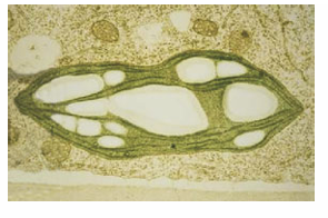 Fig. 8.17 A TEM image of a cross-section of a plant cell showing chloroplasts, organelles responsible for the reactions of photosynthesis (Chapter 23). Chloroplasts are typically 5 µm long. (Image supplied by Brian Bowes.)