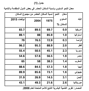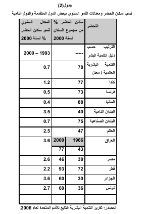 2. إن هناك تفاوتاً بين الدول التي تمتاز بتنمية بشرية عالية انعكست على نسبة سكان الحضر فيها إذ بلغت نسبة سكان الحضر في المانيا (88%) بينما بلغت نسبة سكان الريف فيها (912) وفي كندا نسبة سكان الحضر (9677) يقابلها (23%) سكان ريف وفي فرنسا بلغت نسبة سكان الحضر (76%) يقابلها (924) سكان ريف، وبلغت نسبة السكان الحضر في سوريا بلغت (950.55) ومصر (42.7%) والمغرب (9658) وليبيا (984,5) حسب ما جاء في تقرير التنمية البشرية لعام 2006. وهذا يعكس حالة التوازن بين قلة سكان الريف ومدى استخدام المكننة في الإنتاج الزراعي يقابله حالة التوازن بين ارتفاع نسبة سكان الحضر ومدى توفر فرص العمل بالقطاعات الأخرى في الدول المتقدمة وعكس ذلك في الدول النامية.