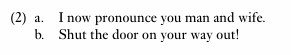 The utterance in (2a), spoken by a suitably qualified person (such as a member of the clergy licensed to perform marriages), in an appropriate setting (like a church), in the presence of two unmarried adults who consent to be joined in matrimony, has the effect of irrevocably altering the social, legal and even spiritual relationship between the two people. That is, language itself can serve as a speech act that forever alters an aspect of our reality.