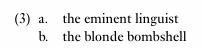 While the example in (3a) focuses on the profession of the individual and her relative standing in that profession, the example in (3b) focuses on her physical appearance. Moreover, although both these sentences relate to a female linguist, the person’s gender cannot be inferred from the sentence in (3a) while it can from the second sentence due to normative patterns of linguistic behaviour and social stereoptypes. That is, we typically use the expression blonde bomb shell to describe the physical attributes of women rather than men.