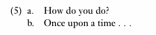 The example in (5a) creates a greeting frame, signalling an acknowledgement of another person and a recognition that this is the first time they have met. It also signals a degree of formality, which expressions like hey, what’s up? or hi would not. Analogously, the utterance in (5b) signals the beginning of a fairy tale. In other words, just by hearing or reading the expression in (5b) an entire frame is invoked, which guides how we should respond to what follows, what our expectations should be and so forth.
