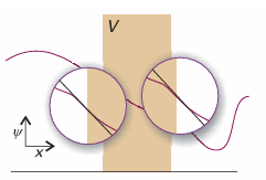 as we can readily verify by differentiating ψ twice with respect to x. The important feature to note is that the two exponentials are now real functions, as distinct from the complex, oscillating functions for the region where V=0 (oscillating functions would be obtained if E>V). To the right of the barrier (x>L), where V=0 again, the wave functions are