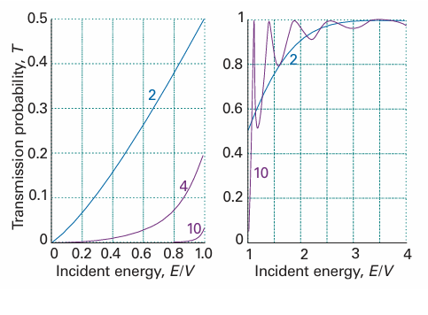 where ε = E/V. This function is plotted in Fig. 9.12; the transmission coefficient for E>Vis shown there too. For high, wide barriers (in the sense that κL >> 1), eqn 9.20a simplifies to