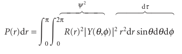 Justification 10.2The general form of the radial distribution function the probability of finding an electron in a volume element dτ when its wavefunction is ψ=RYis|RY2 dτ with dτ=r2drsinθdθdφ. The total probability of finding the electron at any angle at a constant radius is the integral of this probability over the surface of a sphere of radius r, and is written P(r)dr; so