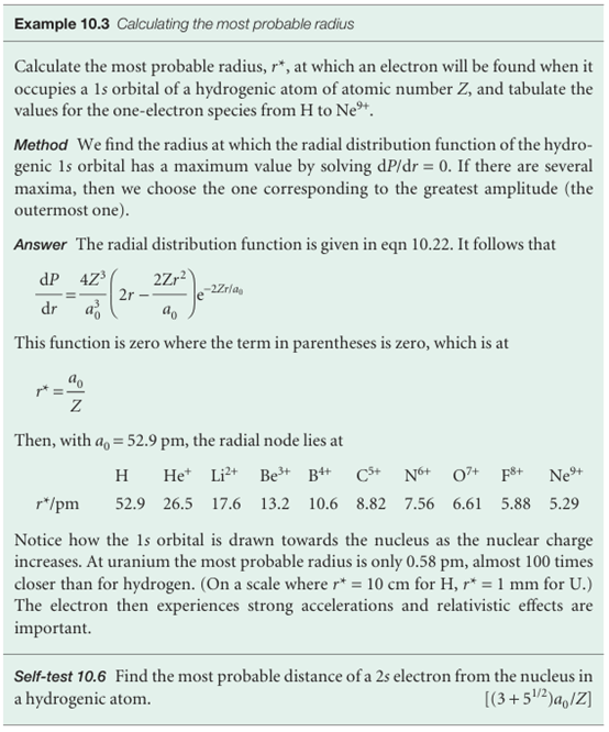 The maximum of P(r), which can be found by differentiation, marks the most prob able radius at which the electron will be found, and for a 1sorbital in hydrogen occurs at r=a0, the Bohr radius. When we carry through the same calculation for the radial distribution function of the 2sorbital in hydrogen, we find that the most probable radius is 5.2a0=275 pm. This larger value reflects the expansion of the atom as its energy increases.