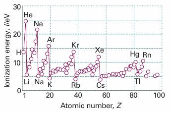 Fig. 10.22 The first ionization energies of the elements plotted against atomic number.