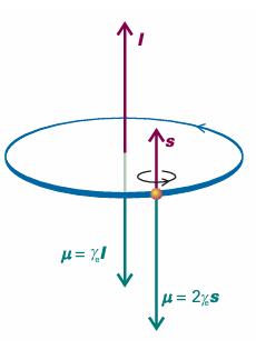 Fig. 10.26 Angular momentum gives rise to a magnetic moment (µ). For an electron, the magnetic moment is antiparallel to the orbital angular momentum, but proportional to it. For spin angular momentum, there is a factor 2, which increases the magnetic moment to twice its expected value (see Section 10.10).