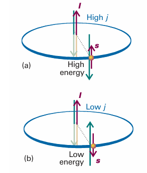 momentum is high; when the two angular momenta are opposed, the total angular momentum is low. The total angular momentum of an electron is described by the quantum numbers j and m j , with j = l + 1/2(when the two angular momenta are in the same direction) or j =l – 1/2(when they are opposed, Fig. 10.28). The different values of j that can arise for a given value of l label levels of a term. For l = 0, the only permitted value is j = 1/2 (the total angular momentum is the same as the spin angular momentum because there is no other source of angular momentum in the atom). When l = 1, j may be either 3/2 (the spin and orbital angular momenta are in the same sense) or 1/2 (the spin and angular momenta are in opposite senses).