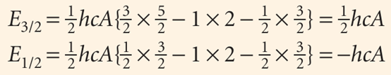 The unpaired electron in the ground state of an alkali metal atom has l = 0, so j = 1–2. Because the orbital angular momentum is zero in this state, the spin–orbit coup ling energy is zero (as is confirmed by setting j = s and l = 0 in eqn 10.41). When the electron is excited to an orbital with l = 1, it has orbital angular momentum and can give rise to a magnetic field that interacts with its spin. In this configuration the electron can have j = 3/2 or j = 1/2, and the energies of these levels are