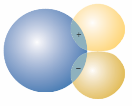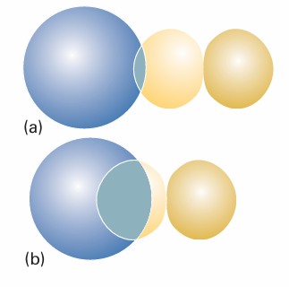 Fig. 11.28 (a) When two orbitals are on atoms that are far apart, the wavefunctions are small where they overlap, so S is small. (b) When the atoms are closer, both orbitals have significant amplitudes where they overlap, and S may approach 1. Note that S will decrease again as the two atoms approach more closely than shown here, because the region of negative amplitude of the p orbital starts to overlap the positive overlap of the s orbital. When the centres of the atoms coincide, S = 0.