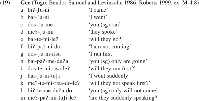 Let us work through the process involved in constructing a position class chart. The first step obviously is to identify each morpheme in the data, using the methods discussed in Identifying meaningful elements. We will practice with the following (slightly regularized) data from the Gee language of West Africa. For simplicity, morpheme boundaries are already marked: