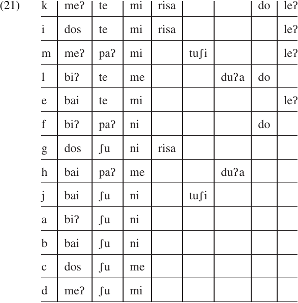 In our present example, we can see that the three tense markers (–ʃu,–paʔ, and–te) form a coherent group, as do the three subject-agreement markers (–ni,–me, and–mi); and there are no words which contain more than one element from either group. So our initial chart might look like (21).
