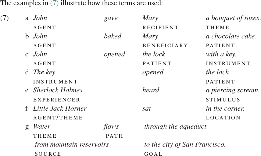 1. Of course, semantic-role categories do not reflect all the semantic differences which could be relevant to grammar. However, semantic roles generally play a crucial part in the assignment of Grammatical Relations, which, in turn, determine a number of important grammatical features. As we will see, these features often include case, agreement, word order, and participation in various syntactic processes.