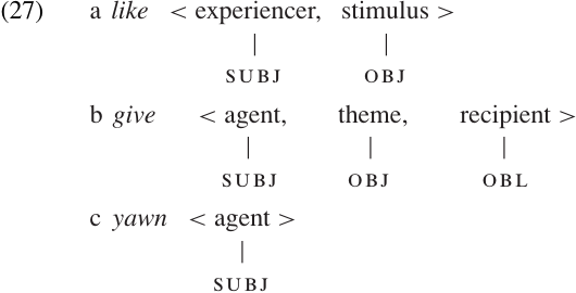 As pointed out above, the sentences in (21) are bad because the number of participants in the clause does not match the number of arguments which the verb requires. More precisely, the SUBCATEGORIZATION requirements of the verbs, which are shown in (27), are not satisfied; the set of Grammatical Relations which the verb must assign does not match the number of phrases available to bear those relations. Like is a transitive verb which requires an object; yawn is an intransitive verb which does not take an object; and give requires three arguments, while only two NPs are present in (21b).