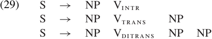 Clearly we need some way to ensure that the number of NPs and PPs generated in the tree structure is appropriate for the specific verb which is chosen. One approach might be to break up the category of “verbs”(V) into three subsets: in transitive verbs (VINTR), transitive verbs (VTRANS), and ditransitive verbs (VDITRANS). We could then write separate rules expanding “S” in the correct way for each of these subcategories. 1