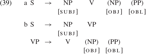 The simple PS rules we have assumed up to now generate only “flat” clause structures, with the verb and all of its complements being immediate daughters of S as shown in (39a). This kind of analysis seems to be correct for many languages, e.g. Malayalam (Mohanan1982). In English, however, and in a number of other languages, there is good reason to believe that the subject NP is not a sister of V. Rather, the verb, its object, and oblique arguments form a constituent labeled VP, and it is this VP which is a sister to the subject NP. The VP analysis for English is shown in (39b).