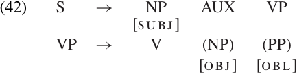 Another question that arises in the analysis of English is the position of the auxiliary verb (AUX). Here the evidence is slightly more ambiguous, and several different analyses have been proposed over the years. Without going into the details of the debate, we will assume that the AUX in English is a daughter of S, a sister to both the VP and the subject NP, as shown in (42).