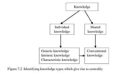 According to Langacker (1987), centrality relates to how salient certain aspects of the encyclopaedic knowledge associated with a word are to the meaning of that word. Langacker divides the types of knowledge that make up the encyclopaedic network into four types: (1) conventional; (2) generic; (3) intrinsic; and (4) characteristic. While these types of knowledge are in principle distinct, they frequently overlap, as we will show. Moreover, each of these kinds of knowledge can contribute to the relative salience of particular aspects of the meaning of a word.