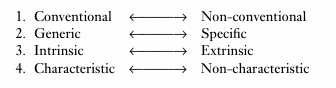The conventional knowledge associated with a particular word concerns the extent to which a particular facet of knowledge is shared within a linguistic community. Generic knowledge concerns the degree of generality (as opposed to specificity) associated with a particular word. Intrinsic knowledge is that aspect of a word’s meaning that makes no reference to entities external to the referent. Finally, characteristic knowledge concerns aspects of the encyclopaedic information that are characteristic of or unique to the class of entities that the word designates. Each of these kinds of knowledge can be thought of as operating along a continuum: certain aspects of a word’s meaning are more or less conventional, or more or less generic, and so on, rather than having a fixed positive or negative value for these properties.