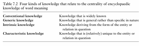 Finally, let’s turn to the question of how these distinct knowledge types influence centrality. The centrality of a particular aspect of knowledge for a linguistic expression will always be dependent on the precise context in which the expression is embedded and on how well established the knowledge element is in memory. Moreover, the closer knowledge is to the left-hand side of the continua we listed above, the more salient that knowledge is and the more central that knowledge is to the meaning of a lexical concept. For example, for Joe Bloggs, the knowledge that bananas have a distinctive curved shape is conventional, generic, intrinsic and characteristic, and is therefore highly salient and therefore central to his knowledge about bananas and to the meaning of the lexical concept BANANA. The knowledge that Joe Bloggs has that he once peeled a banana and found a maggot inside is non-conventional, specific, extrinsic and non-characteristic, and hence is much less salient and less central to his knowledge about bananas. We summarise the four categories of encyclopaedic knowledge in Table 7.2.