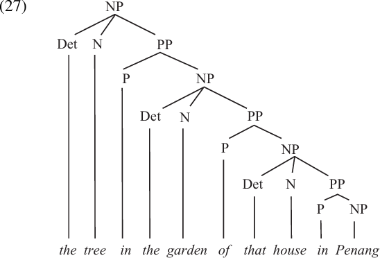 The tree structure for a portion of example (26a) is presented in (27). This is an example of a RECURSIVE structure: that is, one in which a constituent of a particular category (namely PP) can be embedded inside another constituent of the same category, which, in turn, can be embedded inside another such constituent, etc.