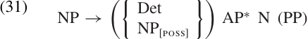 To summarize, we have said that the possessor phrase is an NP which takes the place of a determiner within another NP, and bears the POSSESSOR function within that NP. These facts are represented in the revised PS rule in (31).