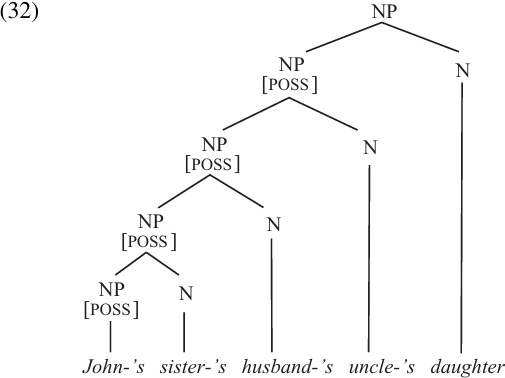 In the simplest case (28a), the NP consists of a possessor phrase (marked with–’s) followed by the head N. But, as the other examples illustrate, the NP may contain any number of possessor phrases.