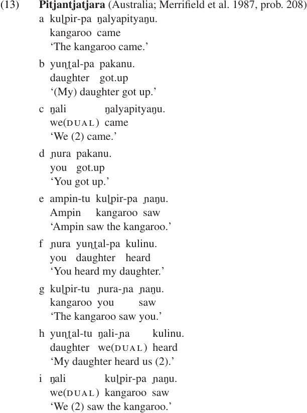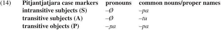 The case endings for nouns and pronouns are listed in (14). This chart shows that pronouns follow a Nominative–Accusative pattern, with the same (zero) case marker being used for intransitive subjects and transitive subjects and a different marker (-ɲa) being used for transitive objects. Common nouns and proper names, on the other hand, follow an ergative pattern, with the same case marker (-pa) being used for intransitive subjects and transitive objects and a different marker (-tu) being used for transitive subjects.