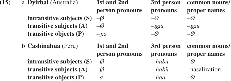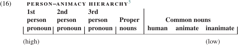 These examples illustrate split systems based on the PERSON–ANIMACY HIERARCHY, which is shown in (16). In almost every instance of split ergativity in which case marking is based on the inherent properties of the noun phrases themselves, categories near the left (= higher) end of the scale will follow the accusative pattern, while categories near the right (= lower) end of the scale will follow the ergative pattern. The dividing point between the two patterns, however, varies from language to language, as we have already seen.