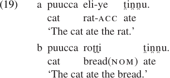 Based on this very small sample of data, can we say anything about the case marking of direct objects in Hindi? At first glance, the evidence seems to be contradictory: the object takes accusative case in (18), but nominative case in (17). It turns out that the case marking of objects is sensitive to animacy: accusative case is used only for animate objects, a pattern consistent with our discussion of the animacy hierarchy above. This pattern is found in a number of widely scattered languages, but is especially characteristic of south Asian languages, including Malayalam. Note the following contrast (Mohanan 1982:539):