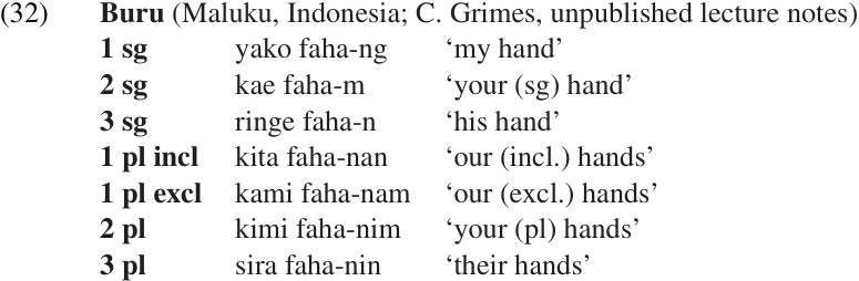 Another example is found in the Buru language of eastern Indonesia. The examples in (32) all contain a free pronoun (the possessor phrase) followed by the head noun, which bears a possessor agreement suffix.