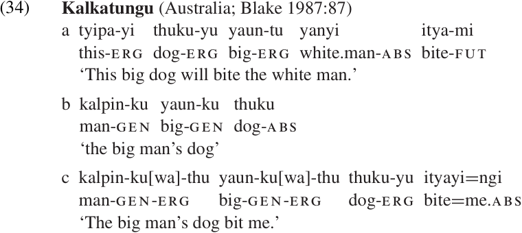 Kalkatungu is an example of a language in which determiners and modifiers (including possessor phrases) within an NP must agree with their head Nfor case, as illustrated in (34). Notice that the elements of the possessor phrase in (34c) bear two case markers: genitive marking the function of the possessor NP itself; and ergative indicating the function of the larger NP to which the possessor phrase belongs. This kind of “case stacking” is relatively rare, but does occur in a number of languages.1