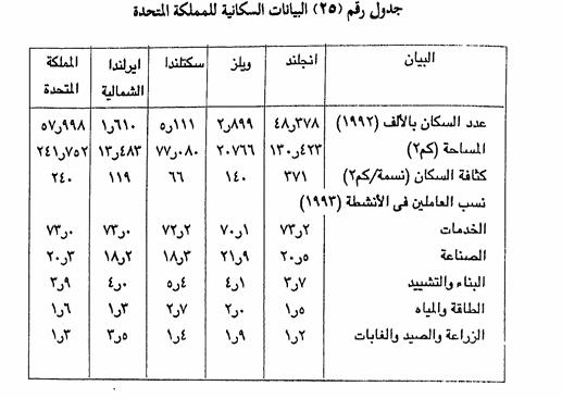 ويظهر من الجدول أن مساحة المملكة المتحدة تقل عن ربع مساحة الأراضي المصرية غير أنها برغم صغر مساحتها نسبيا ووجود مناطق جبلية ومناطق باردة تكاد أن تكون مستغلة بكاملها استغلالا كثيفا، حيث تغطى الغابات 10 % من أراضيها وتشغل المراعي 3 , 46% وتغطى أراضى الزراعة الدائمة 10 % وبقية الاستخدامات بما فيها العمران والصناعة 16,4 % من جملة المساحة.