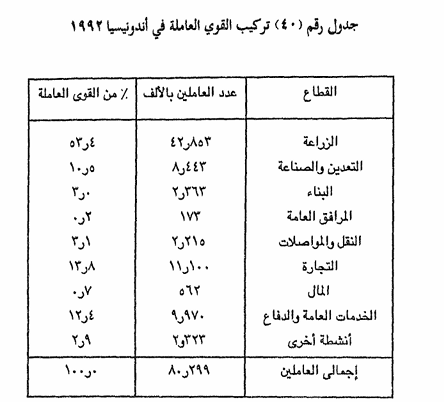 ولعل من دلالات النمو في الاقتصاد الأندونيسي ، ووضوح الفاروق بين الدول الصناعية المتقدمة أن تنظر إلى العاملين بالصناعة والذين لا تتجاوز نسبتهم 0 , 10% من إجمالي السكان والنشاط ، كما أن نسبة العاملين بالخدمات منخفضة كثيرا عن الدول المتقدمة ، وربما أدى اتجاه اندونيسيا للصناعة والتحديث في السنوات الأخيرة إلى تعديل في هيكل القوى العاملة ، ولكن ذلك ليس بالأمر السهل أمام الدول التى تريد الانتقال إلى عصر الحداثة والتقنية ، حيث يتطلب الأمر انتقالا سياسيا واجتماعيا واقتصاديا في نفس الوقت.