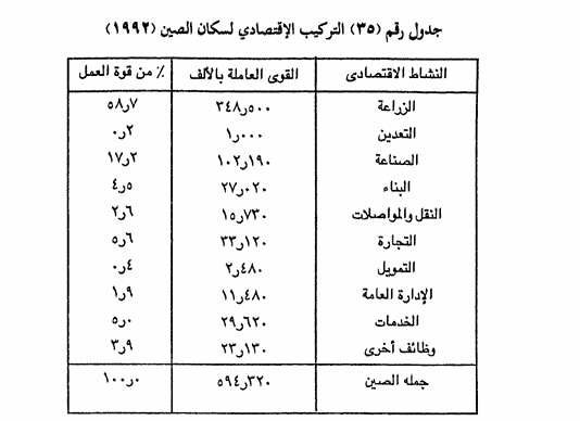 أحد ملامح جغرافية العمران والسكان فى الصين فهي لم تتحول بعد إلى نمط الدول الصناعية أما بالنسبة لتركيب السكان الاقتصادي فيوضحه الجدول رقم (35).
