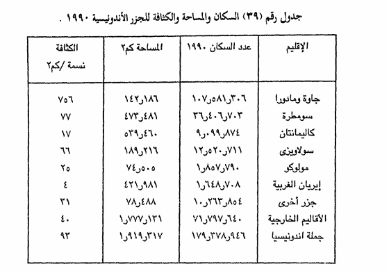 يوضح الجدول رقم (39) توزيع السكان وكثافتهم فى الجزر الأندونيسية ومنه يمكن الخروج بعدة ملاحظات كما يلي:-