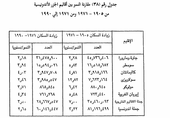 ومن الواضح أن المركز الأول لتركز السكان تحتله جزيرتا جاوة وما دورا ثم تأتي بعد ذلك الأقاليم الخارجية التي تضم بقية أجزاء إندونسيا ، والتي لا تصل كلها إلى الوزن السكاني الجزيرة جاوة وحدها ، علي الرغم من أن كلا من جزر سومطر وكاليمانتان وسولاويزى وإيريان الغربية أكبر بكثير ، ويصدق ذلك على كل الالات التعدادية الواردة في الجدول من 1905 حتى 1990 ولقياس تباين درجات النمو السكاني في أقاليم الجزر المختلفة أنظر الجدول رقم (38).