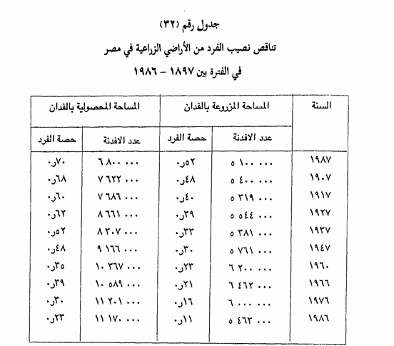 ولعل ذلك يدفعنا إلي تتبع تناقص حصة الفرد في مصر من الأراضي الزراعية فى الفترة 1897 حتى 1986 كما يوضحها الجدول رقم (32) ، ومن فحص أرقام هذا الجدول يتضح أن السكان قد تزايدوا بنسبة 49,6 % خلال 89 عاما في حين أن مساحة الأراضى الزراعية لم تزد خلال الفترة نفسها بأكثر ولم تزد المساحة المحصولية بأكثر من 65 % وأنه فى حين كان نصيب الفرد حوالي نصف فدان من المساحة الزراعية فى عام 1897 انخفض نصيبه إلى ربع ندان فى عام 1960 ، وأما بالنسبة للمساحة المحصولية فعلى حين كان كل شخصين يقابلهما 15 فدان عاما 1897 ، أصبح كل ثلاثة أفراد يشتركون في الفدان الواحد عام 1960 ثم توالى الانخفاض كما يظهر من الجدول رقم (32) ، فإذا أضفنا إلى ذلك ما أصاب الملكية الزراعية فى مصر من تفتت حيث أصبحت القاعدة هي انتشار الملكية الصغيرة ، حيث كانت حوالى 35% من الملكيات الزراعية فى مصر أقل من خمسة أفدنة فى عام 1952 وارتفعت النسبة إلى 57% فى عام 1965 ، وأما الملاك فإن حوالي 95 % منهم يملكون هذه النسبة من الأراضي التي يقل زمام كل منها عن خمسة أفدنة ، وطبقا لنظم الوراثة فإن تفتت الملكيات الزراعية أخذ في التزايد.