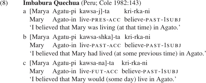 Comrie (1985) states that in Imbabura Quechua, main clause verbs have absolute tense reference while most subordinate verbs get relative tense interpretation.1 In the following examples, the subordinate verb ‘live’ is marked for past, present, or future tense according to whether it refers to a situation which existed before, during, or after the situation named by the main verb. But, since the main verb is marked for past tense, the actual time referred to by the subordinate verb may have been before the time of the speech event even when it is marked for ‘future’ tense, as in(8c):